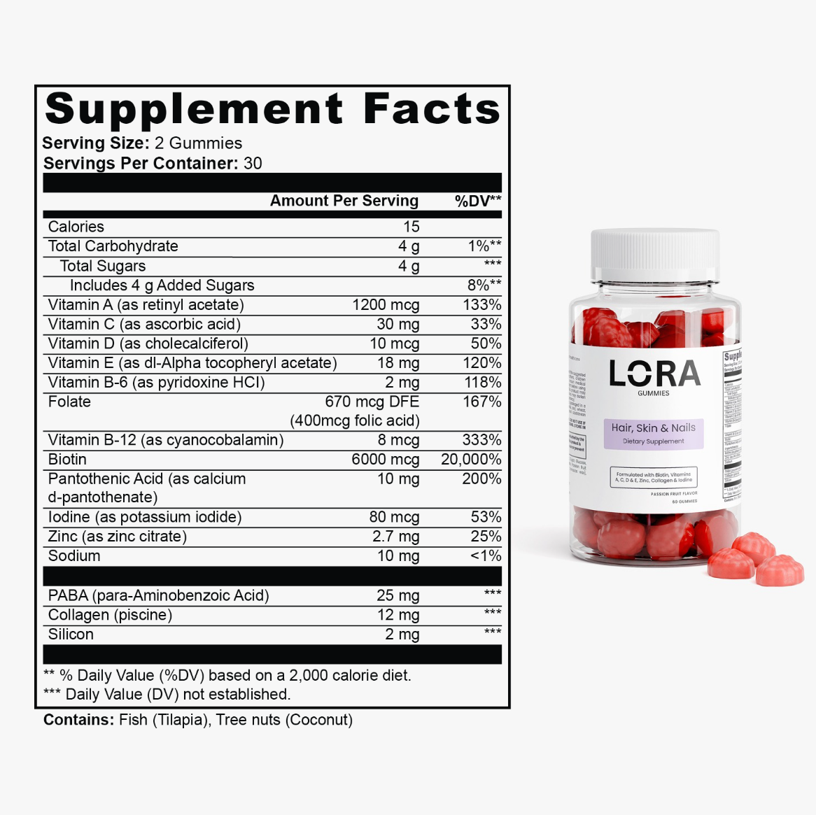 LORA uses a Collagen + Vitamin C “Follicle-Fuel” matrix with key cofactors (biotin, zinc, iodine, B-complex, silicon)—not a one-note vitamin. It’s designed to support shaft strength and reduce breakage/shedding over 6–12 weeks.
