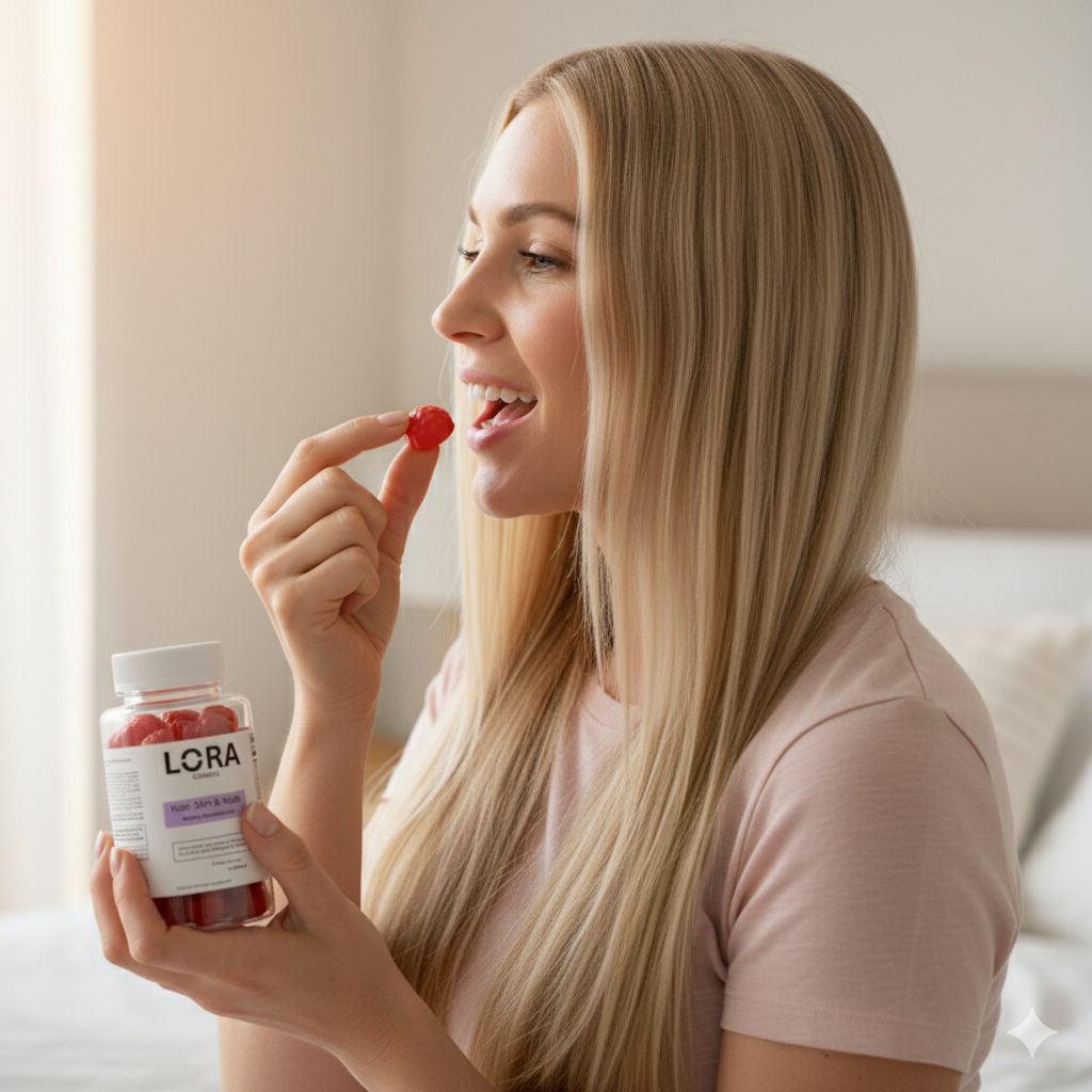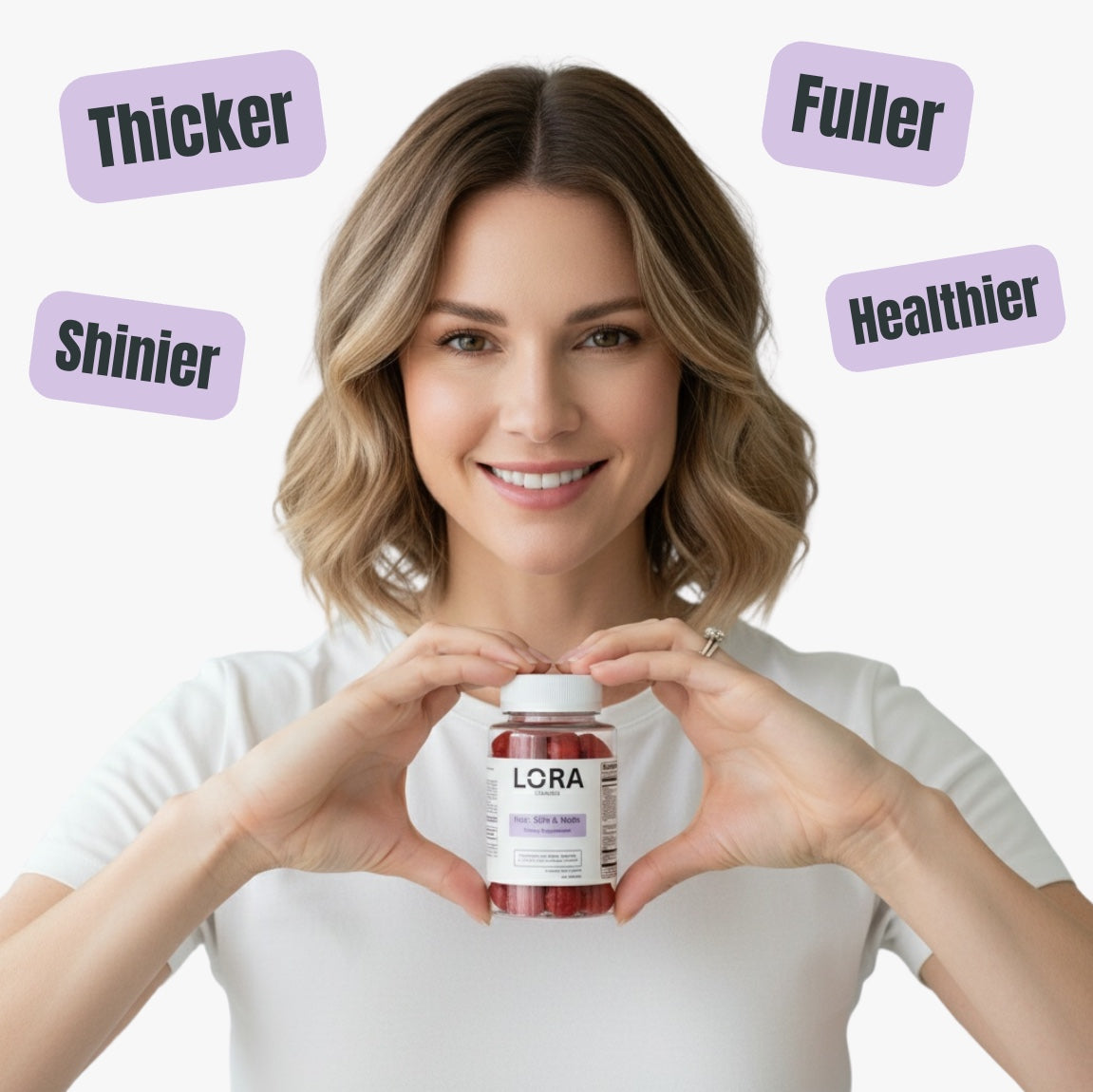 LORA uses a Collagen + Vitamin C “Follicle-Fuel” matrix with key cofactors (biotin, zinc, iodine, B-complex, silicon)—not a one-note vitamin. It’s designed to support shaft strength and reduce breakage/shedding over 6–12 weeks.