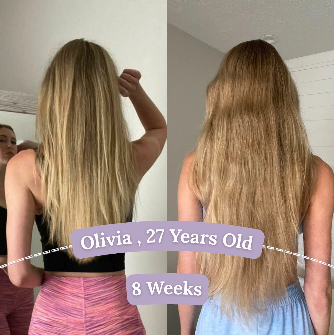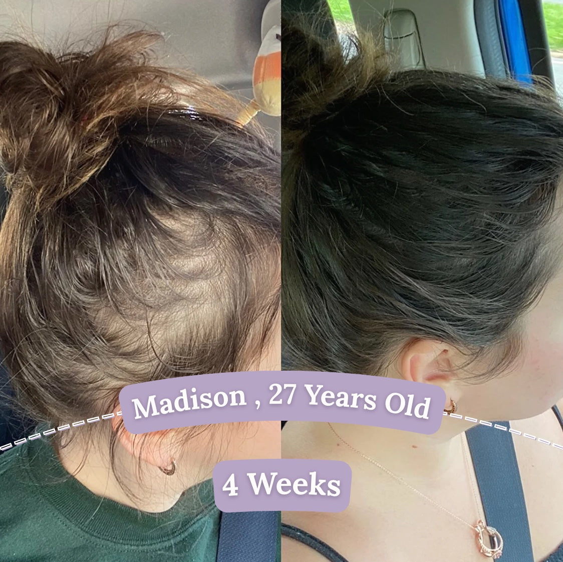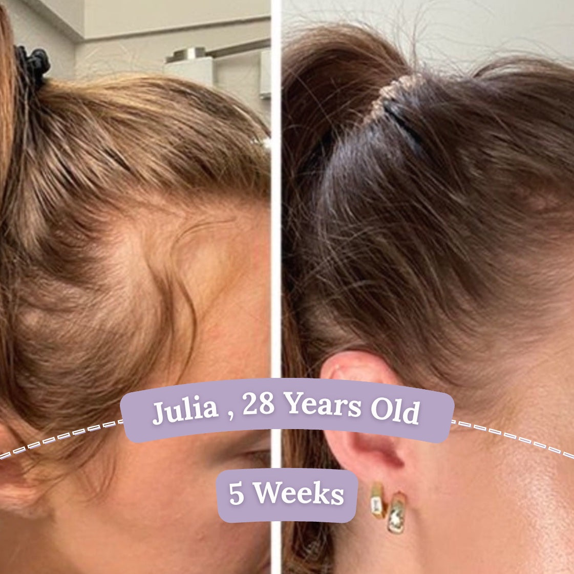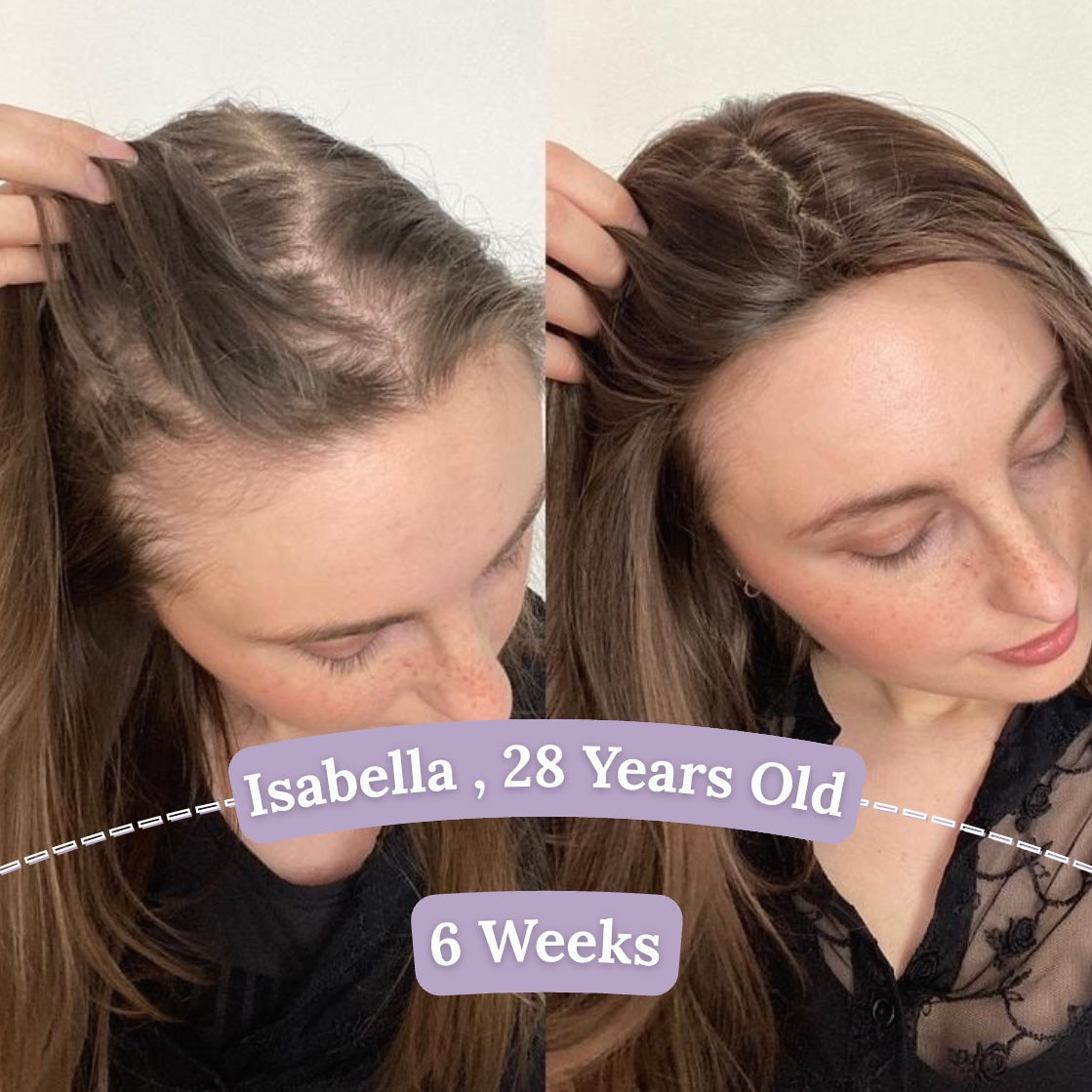 Most women report less shedding in weeks 2–4, baby hairs by weeks 6–8, and fuller-looking strands by weeks 8–12 (with daily use)