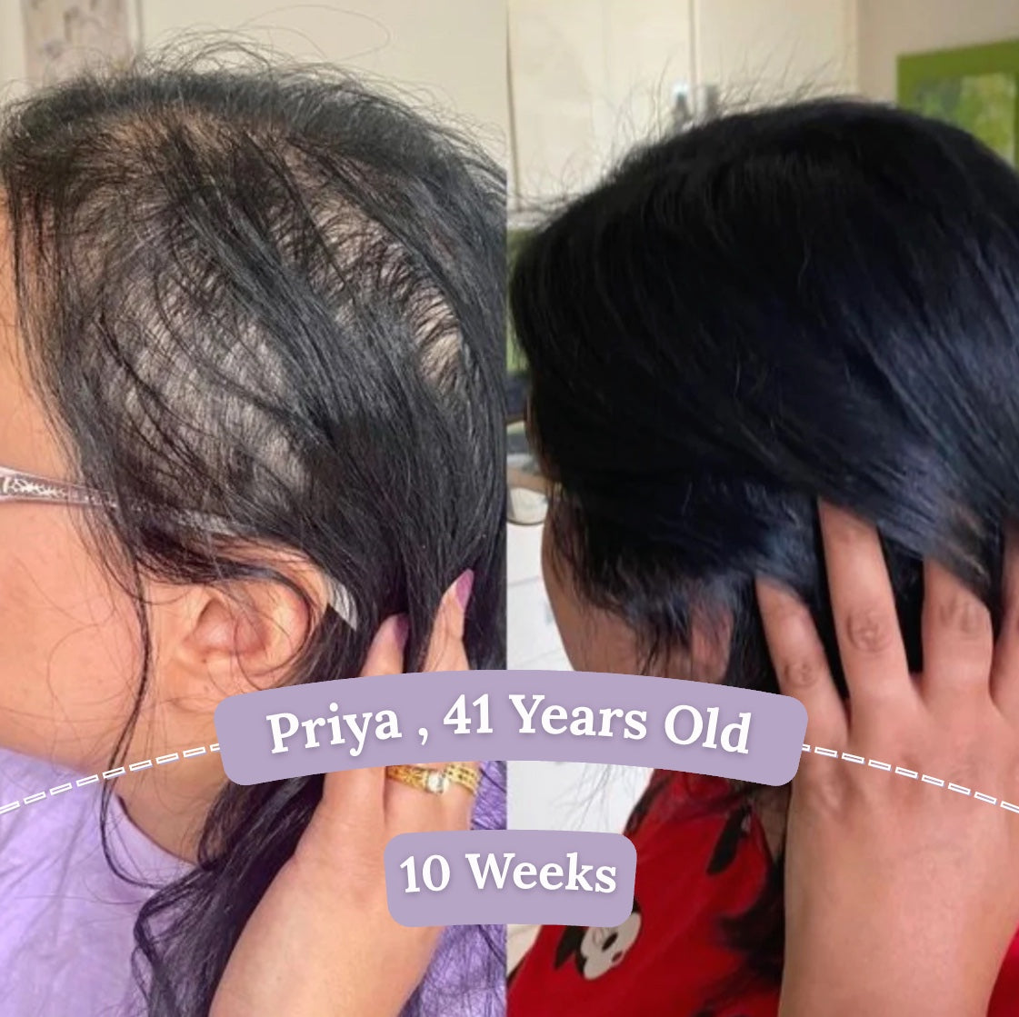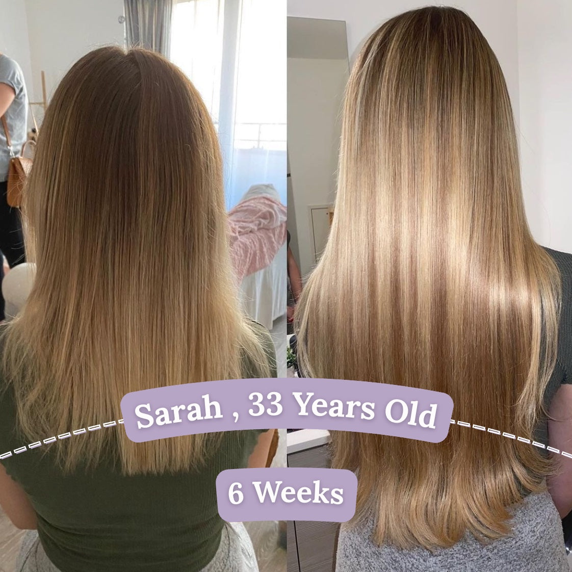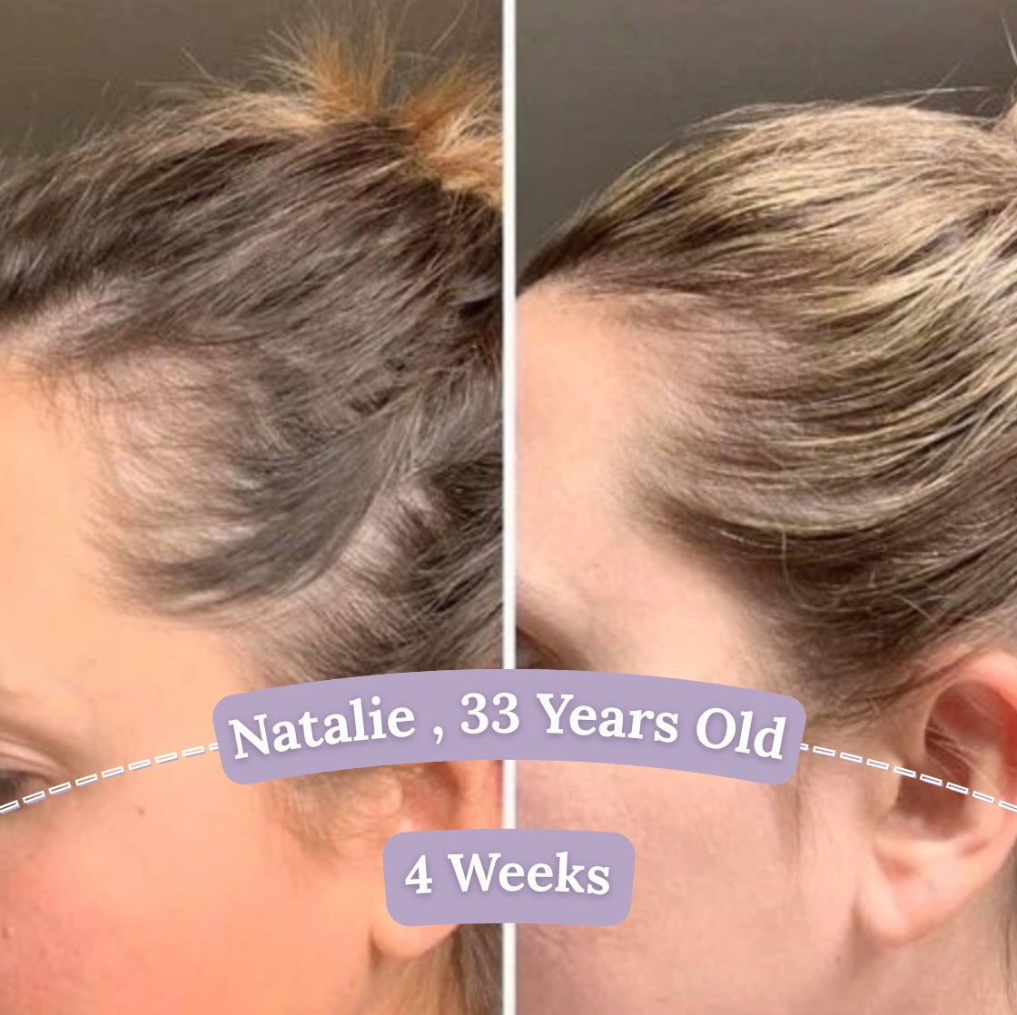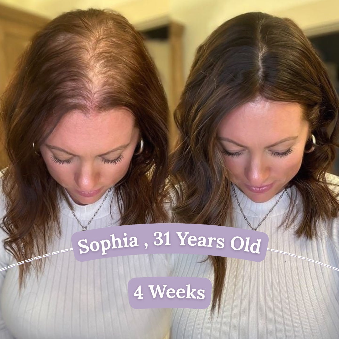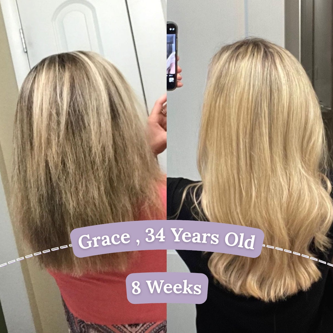 Most women report less shedding in weeks 2–4, baby hairs by weeks 6–8, and fuller-looking strands by weeks 8–12 (with daily use)