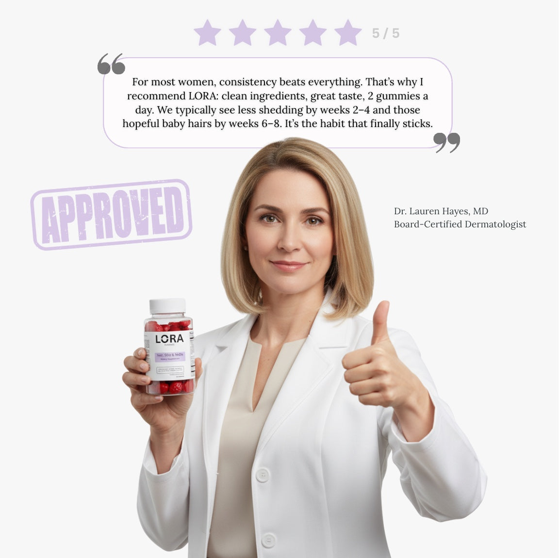 “For most women, consistency beats everything. That’s why I recommend LORA: clean ingredients, great taste, 2 gummies a day. We typically see less shedding by weeks 2–4 and those hopeful baby hairs by weeks 6–8. It’s the habit that finally sticks.”
